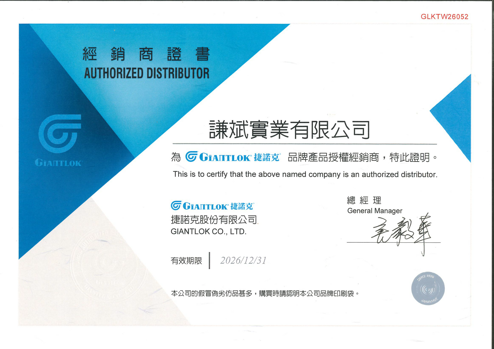 謙斌實業(Humble Voyager Industrial Co., Ltd.)是捷諾克(Giantlok)品牌在台灣市場的正式授權經銷合作夥伴,自2024年起還獲得品牌顧問的授權,旨在應對大南方S廊帶中科技產業、高端製造業(如光電、半導體)及智慧城市等領域的快速成長趨勢,提供更深度的品牌策略及應用諮詢服務。