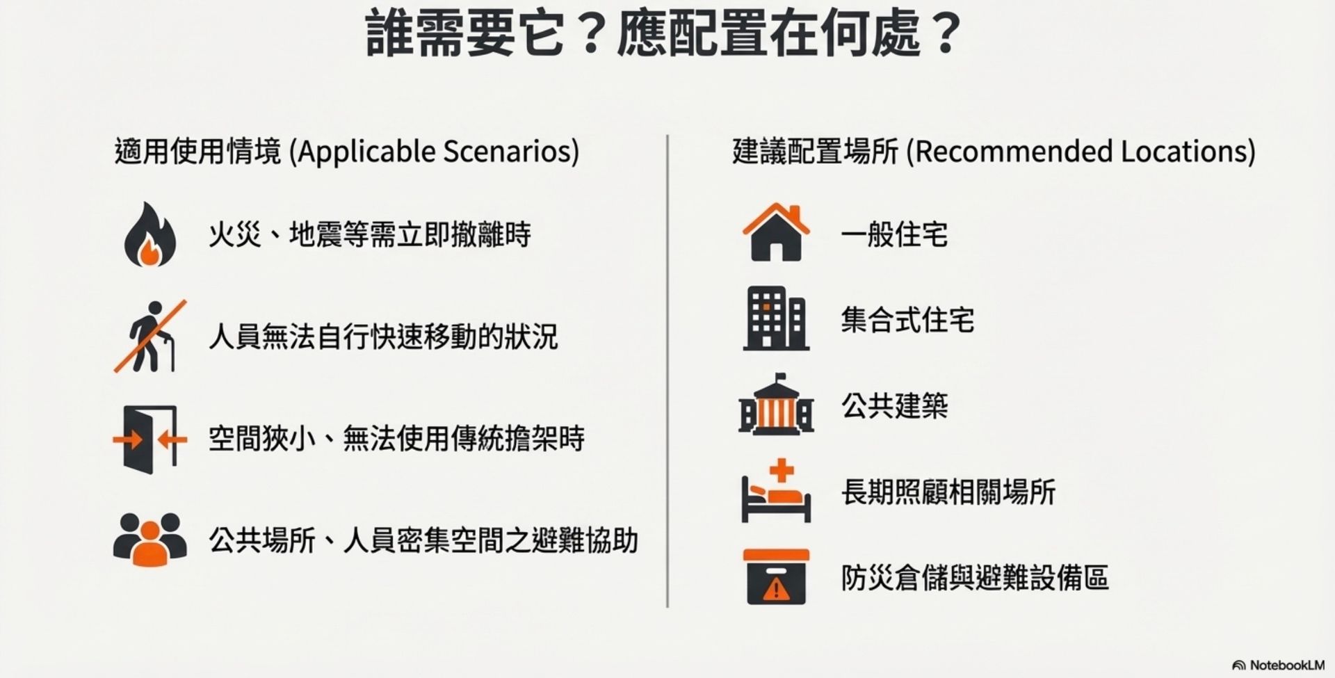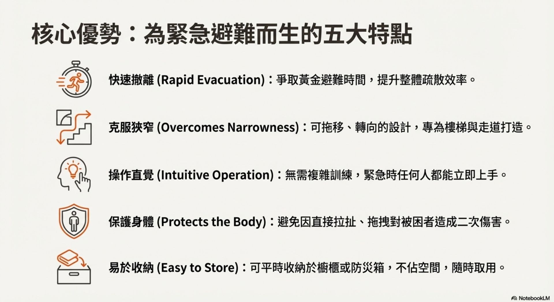 可在火災、地震等突發事件中,協助他人快速移動、搬移或轉移離開危險區域,