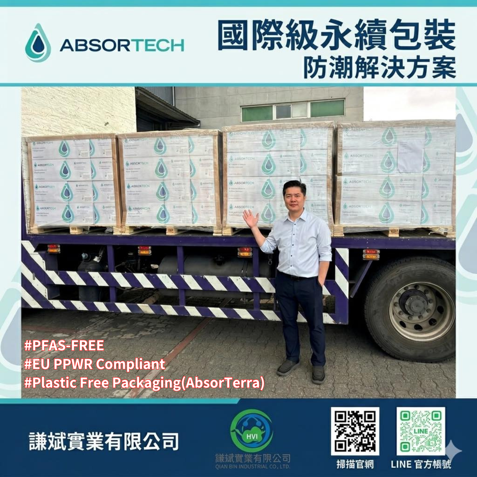 作為台灣的總代理,謙斌實業引進的瑞典品牌Absortech在防潮保護技術領域處於世界領先地位。我們擁有數十年的開發貨櫃乾燥劑產品的經驗,協助客戶於包裝的層面保持您的經營利潤。該品牌是全球第一個採用100%純氯化鈣CaCl2產品的品牌,利用其超強的吸潮能力,產品性能遠超其它傳統吸濕技術。