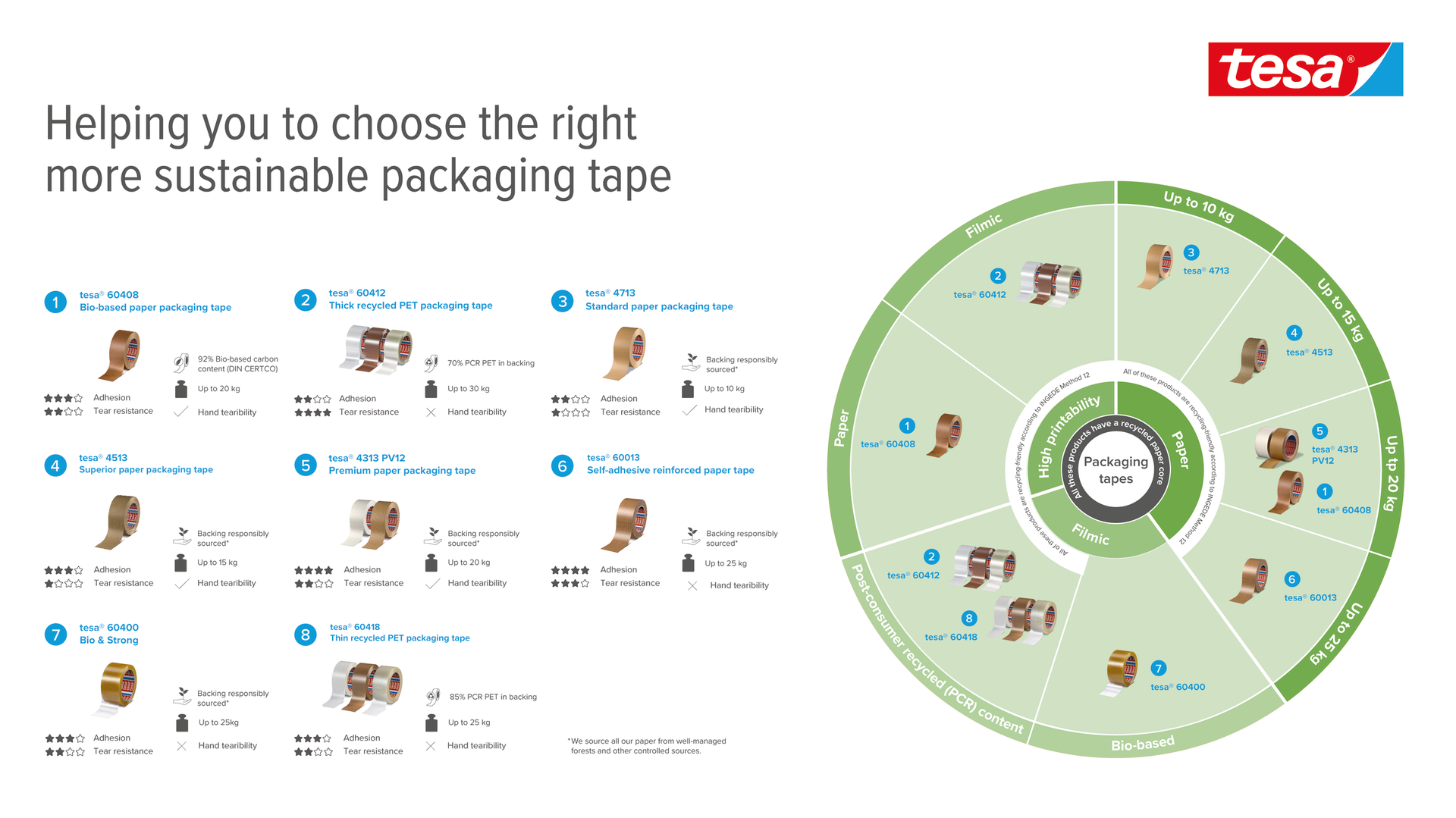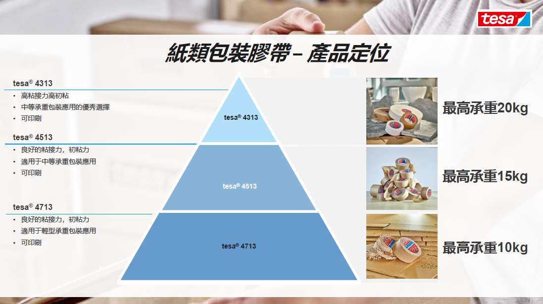 - 謙斌實業目前是德國德莎膠帶在台灣市場的指定戰略合作夥伴,目前我們推廣的德莎膠帶永續類的產品包含紙基(Paper-based)還有生物基(Filmic -based)系列產品;根據認證、承重力、材料等做出基本分類。應用的場域包含台灣最強大的電子業、或是一般製造包裝產業。